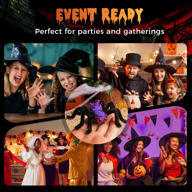 ROLIG STIL – Designad med en fluffig pom-pom-kropp och böjbara trådben, ger denna halloween spindelhår en lekfull charm till din festliga look. Den lägger omedelbart till en humoristisk men ändå stilfull accent, vilket gör den lämplig för fester, trick-or-treating eller temasammankomster. Dess roliga design tilltalar både barn och vuxna, vilket säkerställer en livlig Halloween-atmosfär vart du än går.