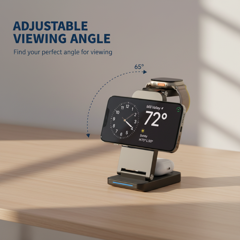 3-I-1 LADDSTATION - Håll ordning och reda genom att ladda din telefon, klocka och hörlurar samtidigt. Detta eleganta ställ eliminerar kabeltrassel och håller alla dina viktiga enheter fulladdade och redo att användas.
