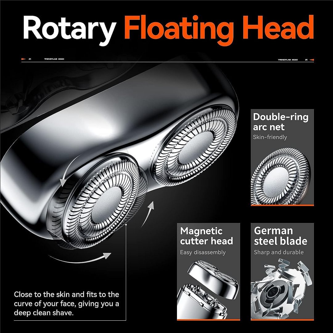 Skarpt virvelblad i rostfritt stål, specialiserat på hårt skägg, 0,1 mm tunn folie i rostfritt stål, dubbelring 3D-knivnät, ökar rakningsvolymen, flytande bågytan slät och tar bort hår från din hud.