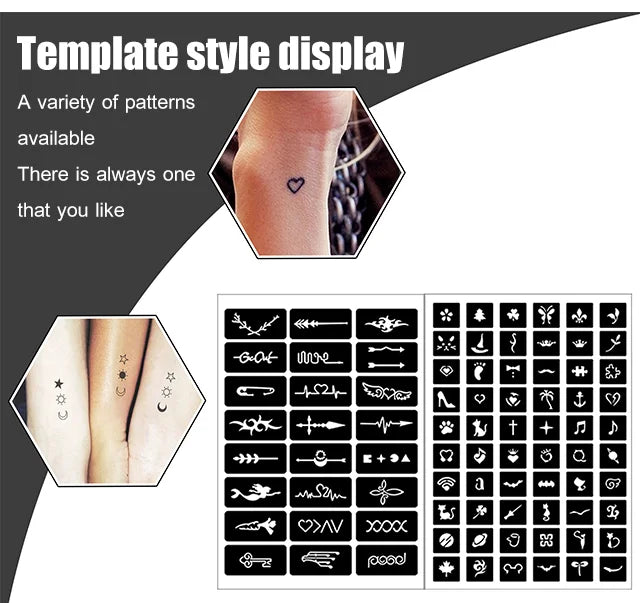 Ett brett utbud av DIY kroppskonstmode. Det inkluderar 3 färgade flaskor med tatuering stinte, 10 ml vardera, och 2 uppsättningar tatuering mallar. Njut av att skapa din egen tatuering!